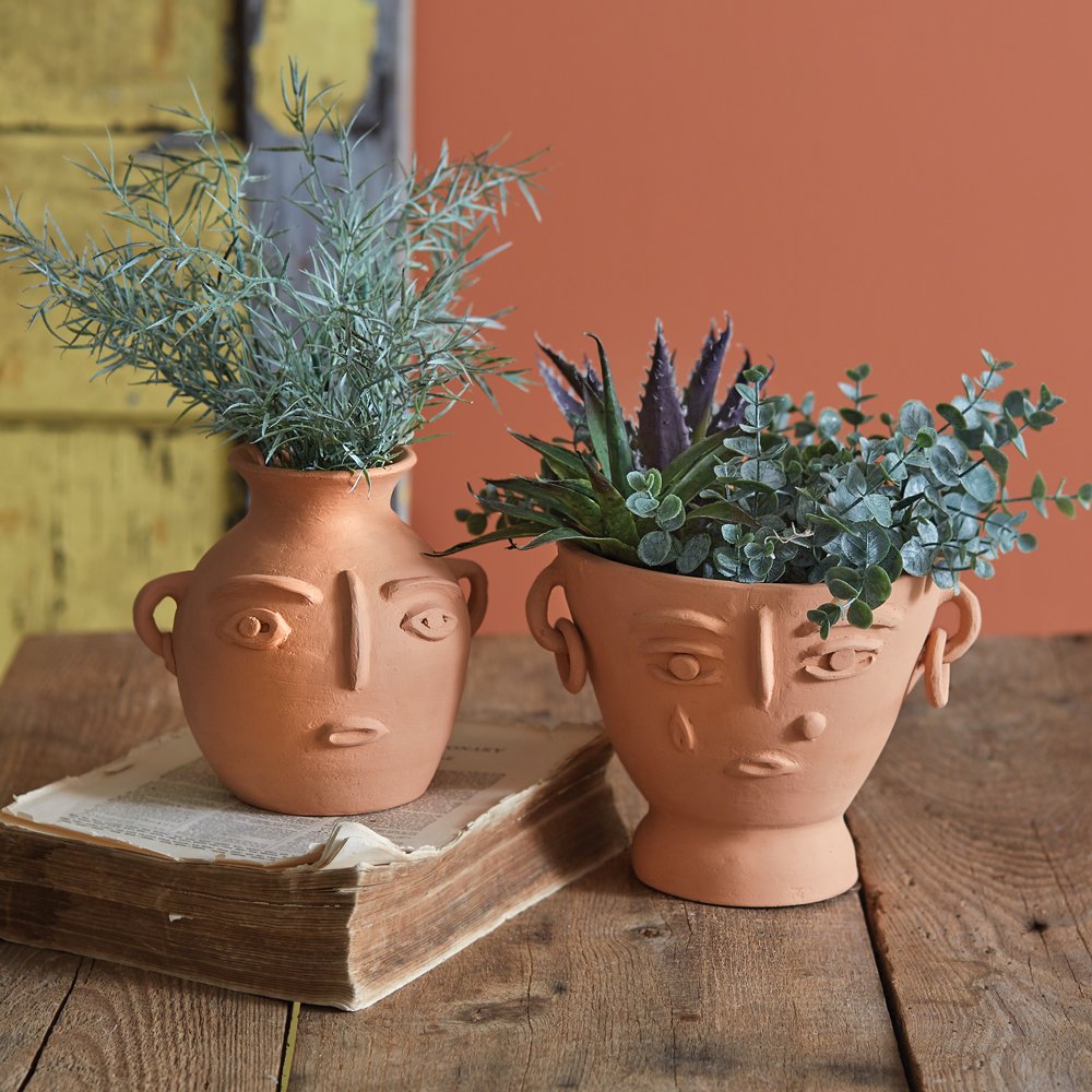 This unique and captivating planter is not just a vessel for your plants, but a masterpiece that adds a touch of innovative elegance to any space. Handcrafted by skilled artisans, its intricate yet abstract facial features evoke a sense of creativity, making it a conversation piece. This terra cotta planter is handmade. Differences in shade and shape are to be expected.