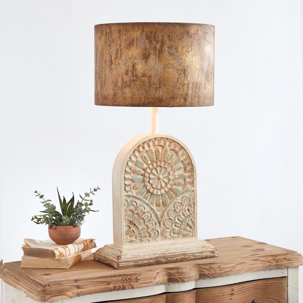Regal in stature, our lamps capture an artistic and high-end essence that leaves a sophisticated touch in a room. The lamp features a metal shade, an intricately carved wood base, and an on/off rocker switch on the cord. It requires a standard light bulb which is not included. 60-watts is the maximum suggested bulb wattage for this item.