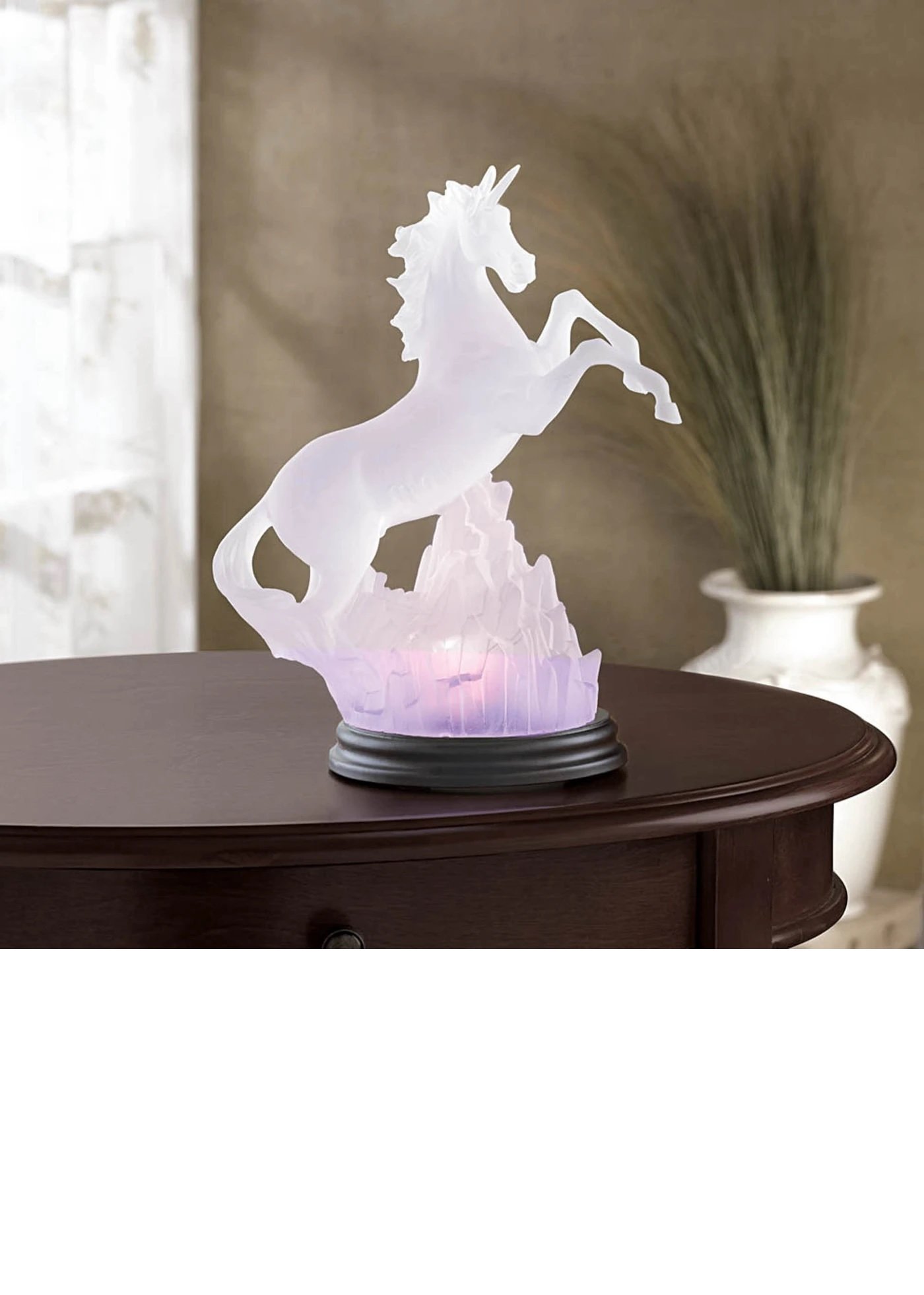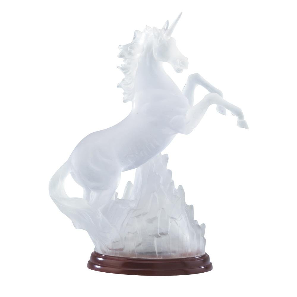 • Looking frozen in time, this frosted figurine features a rearing unicorn on a burnished wood base. The sculpture also lights up to create a spectacular and colorful display of rainbow light. This mesmerizing décor piece is an excellent gift and will look stunning perched on a shelf, desk, or table.