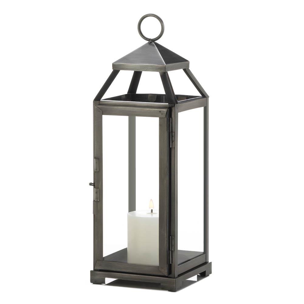 • Unique and eye-catching, this metal pewter lantern will add intrigue to your outdoor or indoor décor. This lantern features a durable iron frame with a brushed pewter finish, encased with glass window panes. Place a pillar candle inside the metal lantern to bask any room in a soothing warm glow.