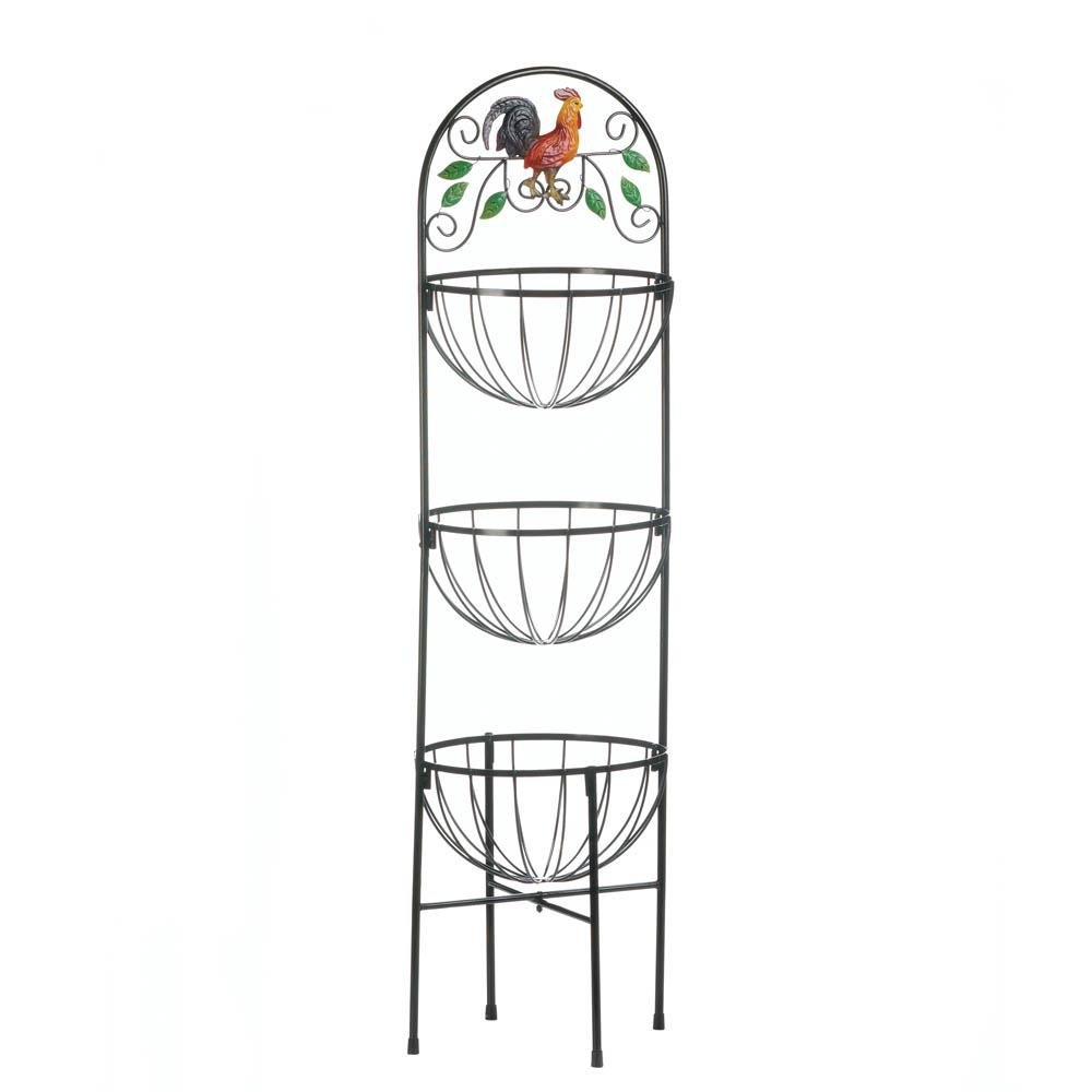 Oh what fun youÆll have filling the three baskets of this tall decorative stand! On top is a proud and colorful rooster and the wire baskets below are perfect for produce or decorative items. The decorating possibilities are endless! Weight 4.4 pounds. 12" x 12" x 43.5". Iron. UPC Number: 849179029586.