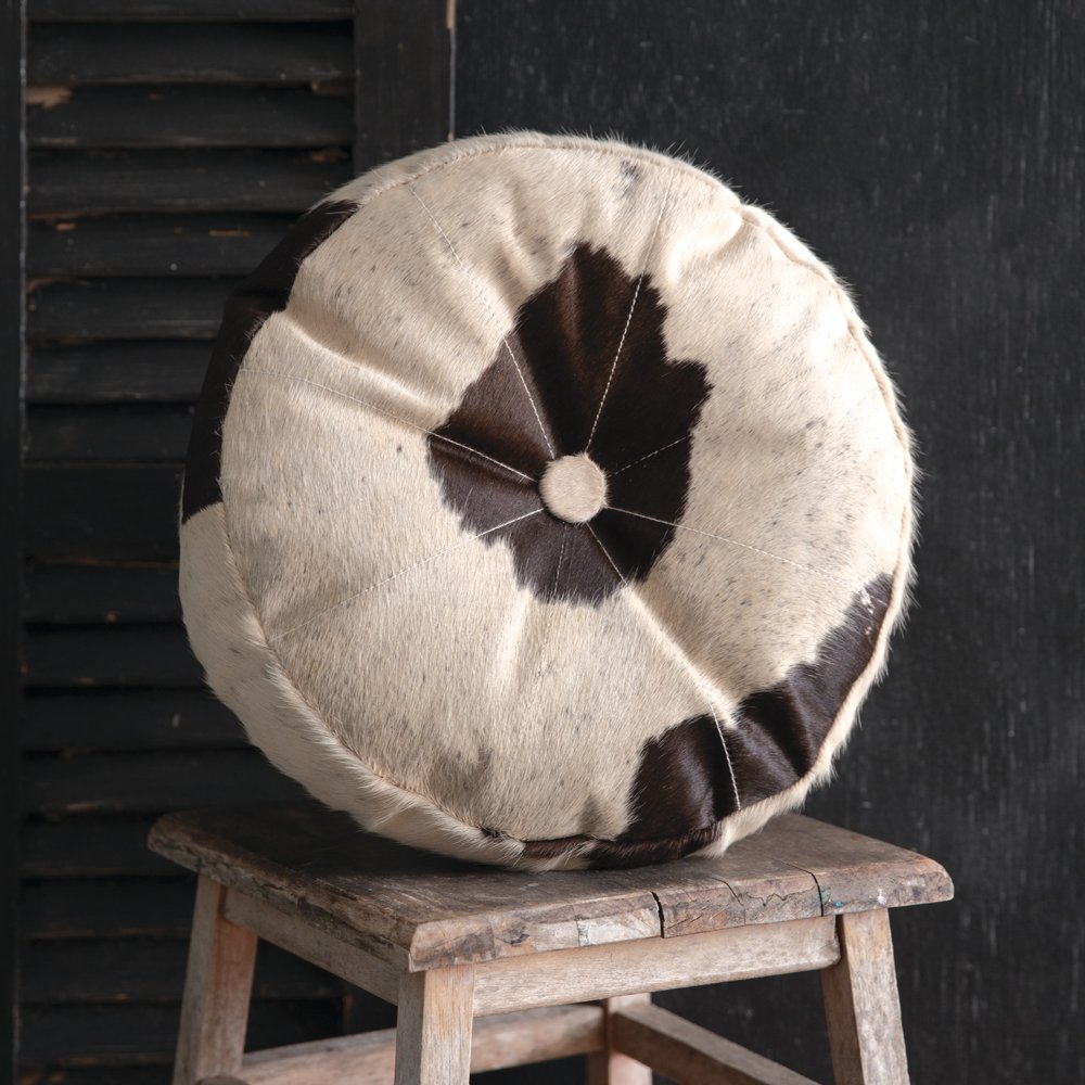 Embrace the natural elegance of genuine cowhide as you add a touch of sophistication to any space. This unique round throw pillow is sized perfectly to be versatile. Made from real cowhide, the back is 100% cotton and is stuffed with a comfy polyfil material. This pillow does not feature an insert, as it is a sown-together piece.