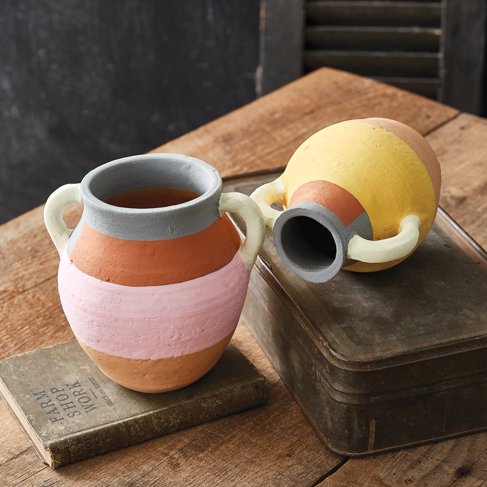 Blocked with soft colors, these terra cotta vases are a fun addition to a patio, garden, or sunroom. Place your favorite flowers inside for a bright and cheery room. Hand-sculpted and dipped in paint, these items are completely handmade making each and every item unique. Pink vase measures 7''W x 6''D x 6½''H and yellow vase measures 6''W x 5''D x 6''H.