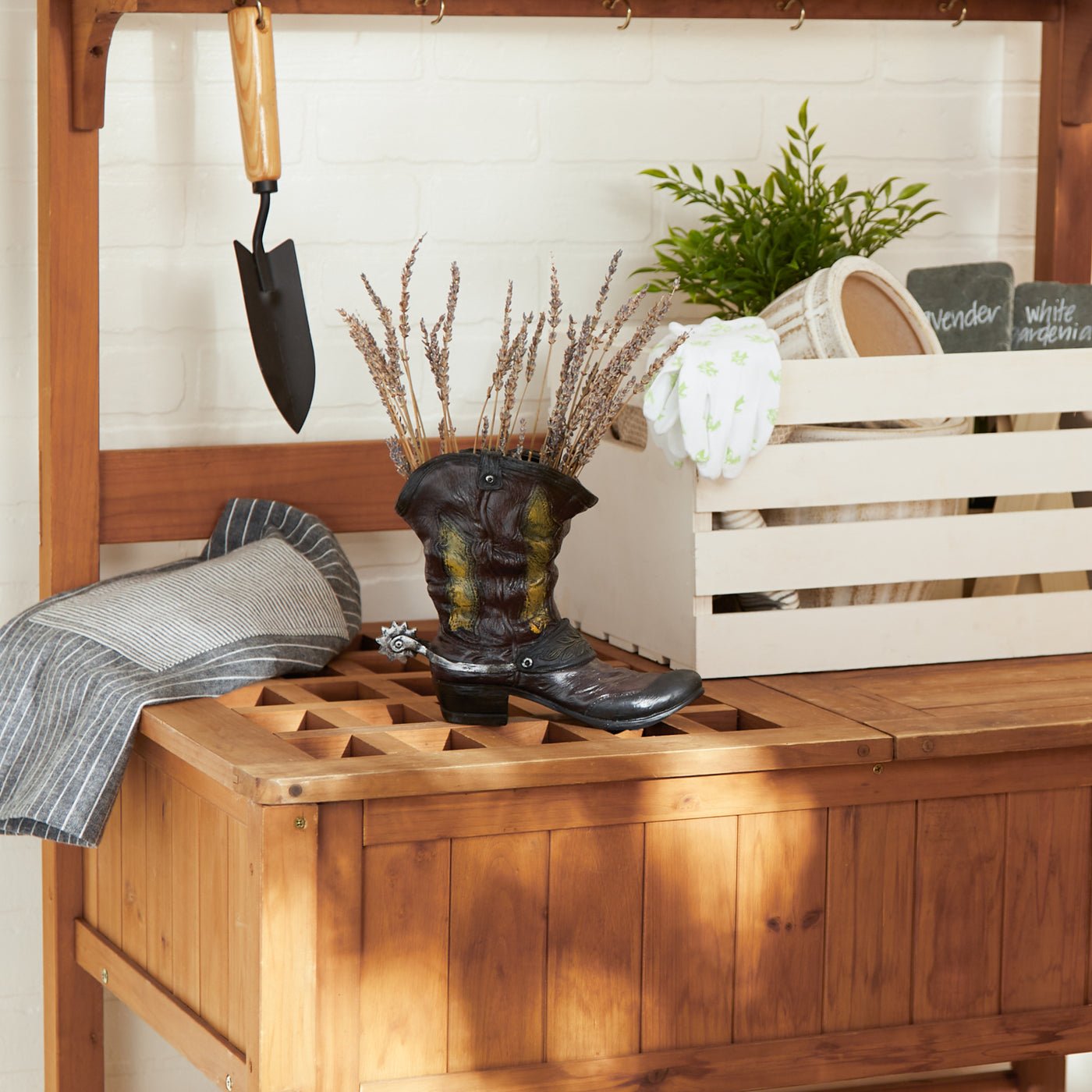 • Let your favorite flowers or plant saddle up in this charming cowboy boot planter. This planter has plenty of Western flair and looks like a well-worn and weathered boot, complete with a spur on the back.