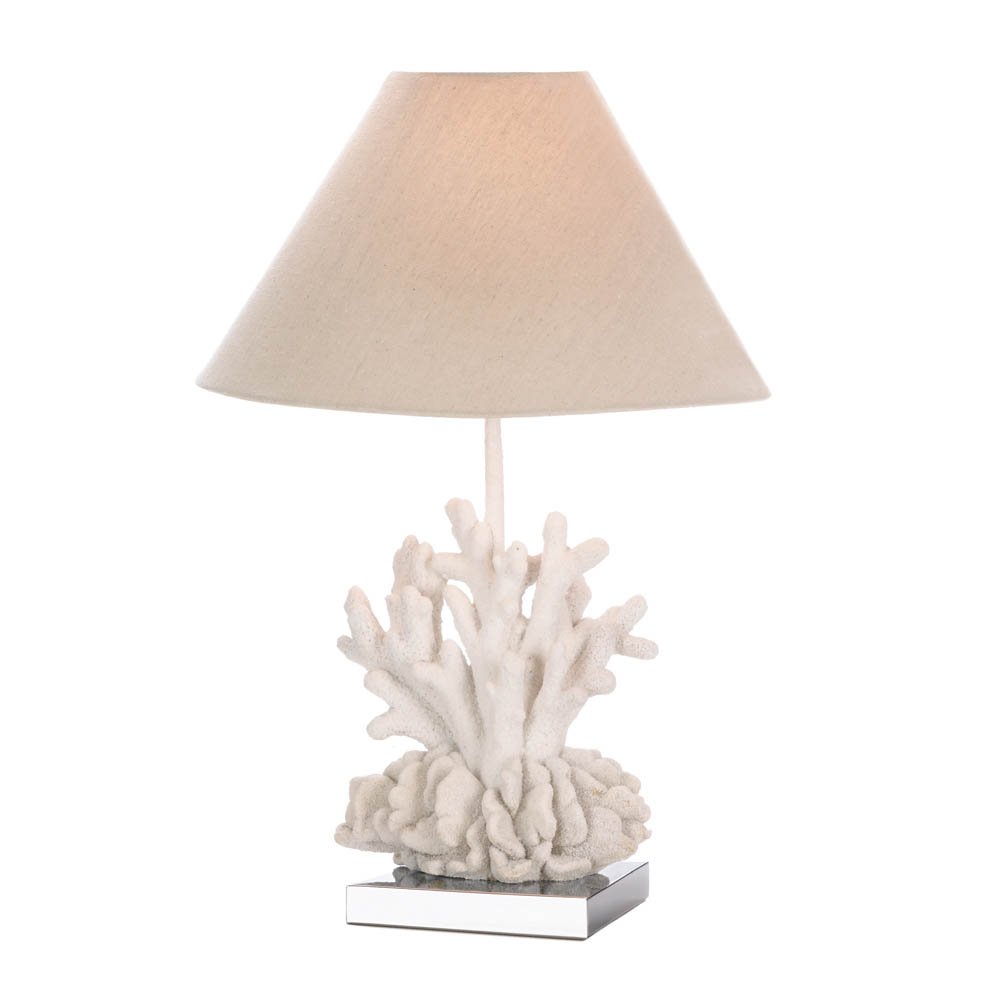 Shine a light on one of natureÆs most fascinating designs! This gorgeous white coral table lamp features a stainless steel square base, neutral shade, and a fantastic coral sculpture that will brighten your room even when the lamp is switched off. 13" diameter x 20¢" high; shade: 13" diameter x 8" high; base: 7¥" x 6" x 12" high; 65" long power cord. Polyresin, polyester cotton, stainless steel and iron. Max 40W Type A light bulb not included. UPC: 849179026974.