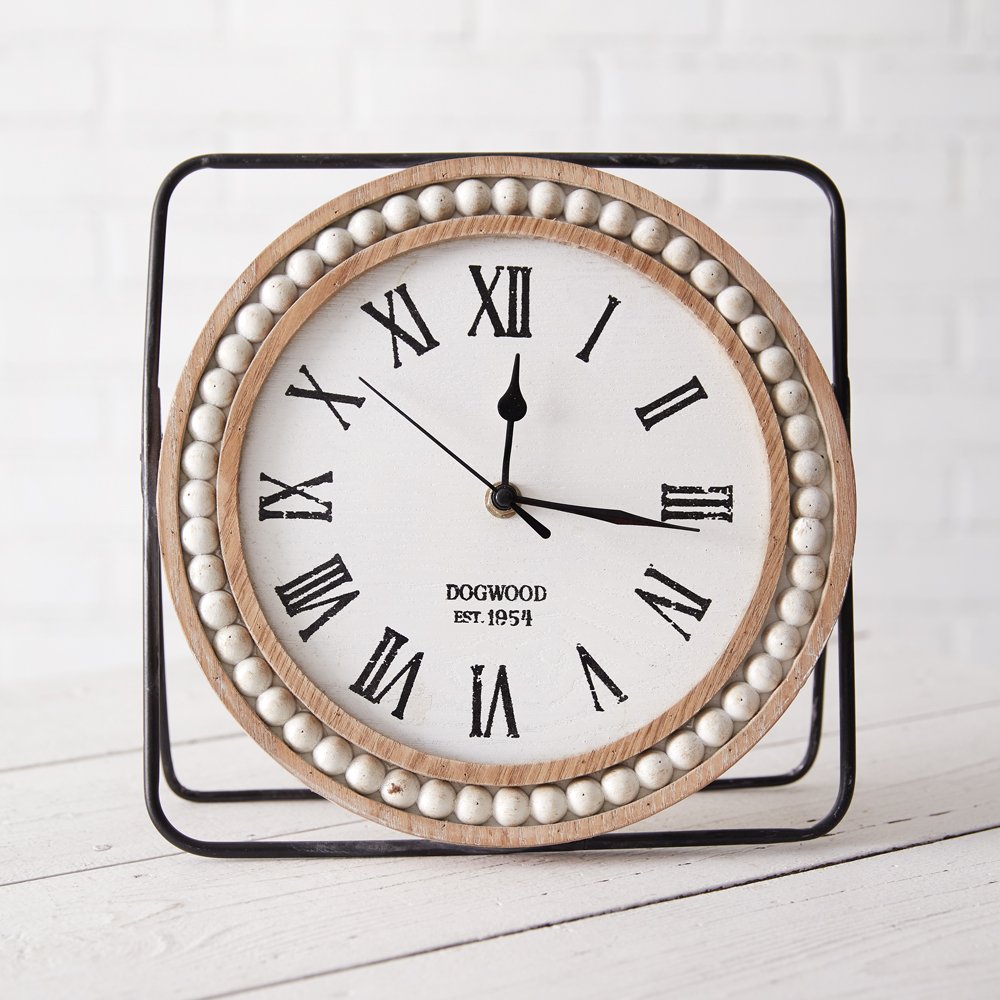 This neutral tabletop clock would fit in almost any décor. It's made of wood with a sturdy frame with rounded corners. This item is 3''D when standing and requires 1 AA battery, not included.